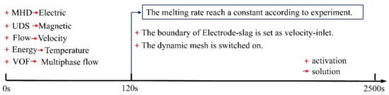 In Figure 3, the Magnetohydrodynamics (MHD) module is used to solve the electric field, and then the User Defined Scalars (UDS) equation is used to solve the magnetic field. According to our experiments, the melting speed of the electrode tends to be a constant within two minutes. First, the electromagnetic field, the flow field and the temperature field are solved by iteration for 120 s. The total amount of steel melting in two minutes is ignored, so the dynamic mesh is turned on to drive the compound roll to slide down relative to the slag pool after two minutes. The melting rate calculated from the experiment is used for the velocity-inlet at the electrode-slag boundary to keep mass conservation.