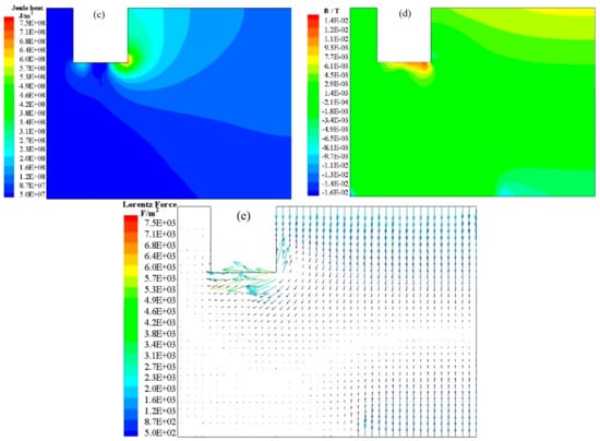 A 2D axisymmetric model is established to develop a better understanding of the basic ESRC phenomenon. When the immersion depth of electrode into the slag pool is 20 mm in the condition of 40 V, the constant descending rate of electrode is 0.257 mm/s. In Figure 4, the electrical parameters are only analyzed in the slag pool because the conductive circuit is composed of the power supply, consumable electrode, slag pool and current carrying mold. The potential gradient is larger between the electrode and mold shown in Figure 4b. The maximum current density appearing on the electrode right corner is 52,500 A/m2. The current density gradually decreases as the resistance increases. Thus, there is almost no current on the left side of the electrode. Joule heat density has a positive correlation with the current density, so the larger value of the joule heat density is near the right side of the electrode shown in Figure 4c. In Figure 4d, the magnetic flux density is complicated. The maximum B that lies on the lower right corner of the electrode is about 0.013 T. When the current passing through the slag pool comes across the magnetic field, the liquid slag will be subjected to Lorentz force. The cross-product of the maximum current and magnetic flux density leads to the maximum Lorentz force on the lower right corner of the electrode. The Lorentz force on both sides of the electrode is not symmetrical. In the right region of the slag pool, the Lorentz force directions of the upper part and lower part are opposite in Figure 4e.