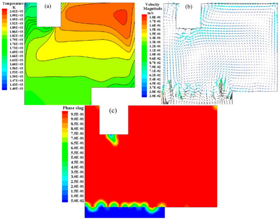 Contour of parameter in the slag pool: (a) velocity magnitude; (b) temperature field; (c) phase of slag.
