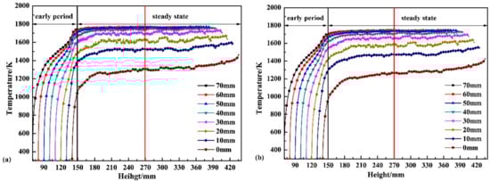 As the electrode continuously melts, molten steel solidifying on the mandrel surface forms the working layer. The working layer and mandrel synchronously move down along the red arrow in Figure 6a, so the height of compound roll is increasing as shown in Figure 6a–e. The mandrel is divided into an infinite number of cross sections such as cross-section (M). During the withdrawal process, every cross section successively passes the 0~70 mm heating distance in the slag pool as shown in Figure 6a. The monitoring points are set up to record the temperature when the cross sections pass through the slag pool. They are stationary relative to the coordinate axis. The axial positions of 16 red temperature monitoring points are the heating distance that are 0, 10, 20, 30, 40, 50, 60 and 70 mm, respectively. The radial positions are at a 2 mm and 4 mm depth into the mandrel surface in turn. Lines (0~7) only represent the axial positions, not the radial positions. The starting height on the different monitoring points is 140~70 mm, and the end height is 460~390 mm, respectively. Therefore, the starting points and end points of eight temperature curves are different in Figure 7. But the length of the path lines (0~7) that are monitored on 16 different points is the same. Note that (A) point (2 mm, 270 mm) and (B) point (4 mm, 270 mm) are on the cross section (M).