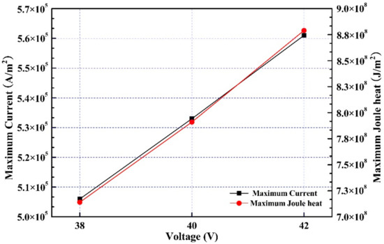 The current is decided by the electric conductivity of the material () and electric scalar potential (). The direct current (DC) is applied. Therefore, the second term in the right-hand side of Equation (1) is neglected because there is no effect of eddy current. Thus, Equation (1) can be written as: