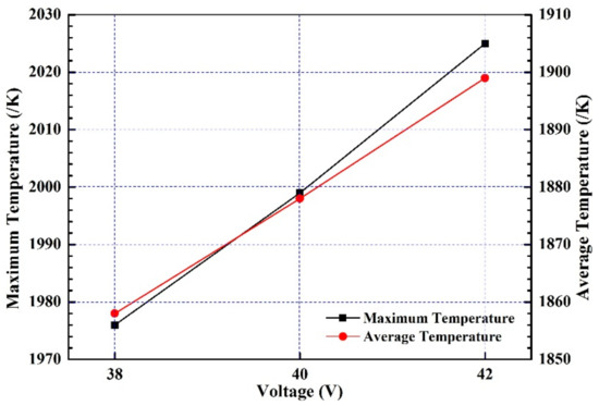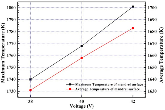 Evolution of the maximum and average temperature of the mandrel surface with different voltage at steady state.