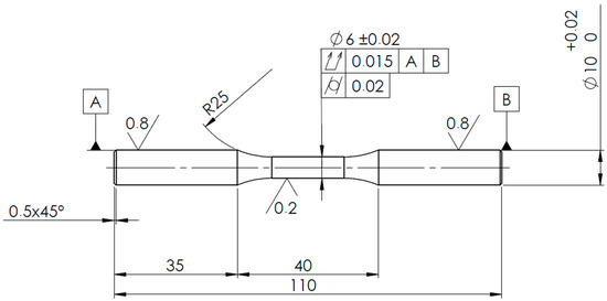 The testing procedure was based on ISO 1143 Standard for rotating bending fatigue testing [36]. The Standard defines the testing procedure, the load scheme, and the specimen geometry. Specimens were designed with cylindrical smooth geometry with uniform 6 mm diameter at the gage. The smallest recommended dimension by the Standard has been chosen as the best compromise between Standard consistency and manufacturing costs. A sample drawing including its dimensions as well as dimensional and geometrical tolerances is shown in Figure 1. It must be pointed out that the specification regarding surface quality was not considered for the “as built” condition, to properly account for the effect of machining.