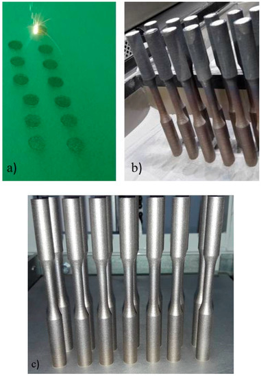 (a) As Built specimens during scanning; (b) Specimens cleaning from powder; (c) Specimens after micro-shot-peening.