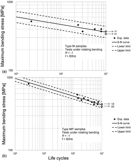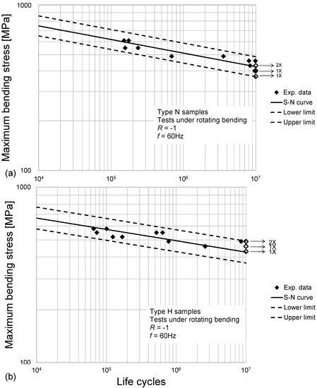 The results of the fatigue tests were processed, to obtain the S-N curves in the finite life domain [42]. Curves trends, together with their upper (90% failure probability) and lower (10% failure probability) bounds at the 90% confidence level, are shown in Figure 5 and Figure 6 (with reference to Sets N, H, M, MP), using double logarithmic scale, including also details regarding specimen type, load ratio and testing frequency, as well as arrows indicating run outs. The related equations are provided in Table 8, in the terms of the coefficients of the formulas in Equations (1) and (2), considering the linear model that proved to be the most suitable, based on [42].