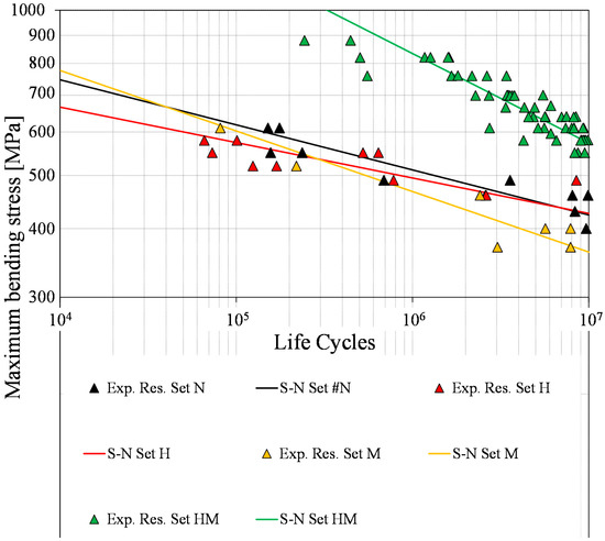Comparison between the S-N curves in the finite life domain for Sets N, M, H, and HM.