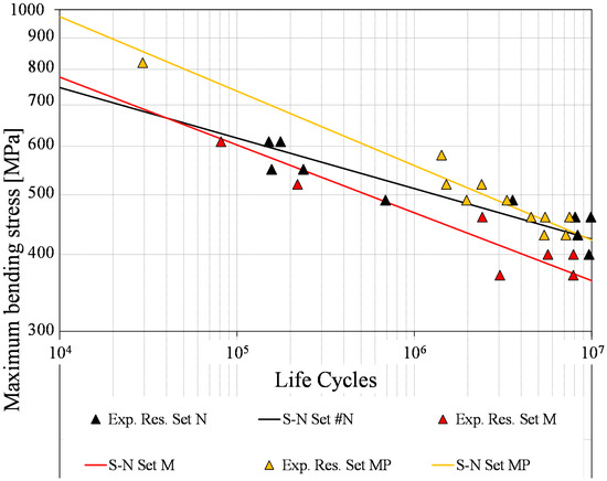 A final analysis was conducted, also including the curve for the MP Set. The S-N curves for Sets N, M, and MP, i.e., for all the Sets, which did not undergo the aging treatment, are plotted together in Figure 8. The tool of one-way ANOVA with three levels has been utilized to compare the three curves, as concisely described below.