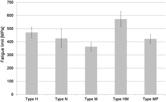 The fatigue limits for all the sample types with their confidence band (90% confidence level) are shown in the bar graph in Figure 9. As mentioned above, the fatigue limits were worked out by the Dixon method with related confidence analysis, except for Set HM: in this case, the fatigue limit was extrapolated by the S-N curve as the stress corresponding to an expected life of 107 cycles. The scatter evaluated in the finite life region was also applied at the fatigue limit, while keeping the same level of confidence for comparison purposes [48]. The estimated value of FL for sample type HM is 573 MPa, for sample type H is 471 MPa, for sample type N is 426 MPa, for sample type M is 363 MPa, and for Set MP is 423 MPa. The sample sets named H and HM underwent heat treatment, whereas the other threes did not undergo heat treatment. The UTS of MS1 Maraging Steel is 1100 MPa in the as-built condition; after hardening, it is drastically incremented up to 2050 MPa, corresponding to almost 100% increase of UTS following heat treatment [38].
