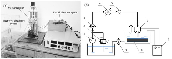 (a) Experimental system of electrochemical machining. (b) Design of experimental setup system: (1) flow pump with high pressure; (2) relief valve; (3) filter; (4) pressure regulating valve; (5) pressure gauge; (6) tool cathode; (7) power supply; (8) tool anode; (9) filter.