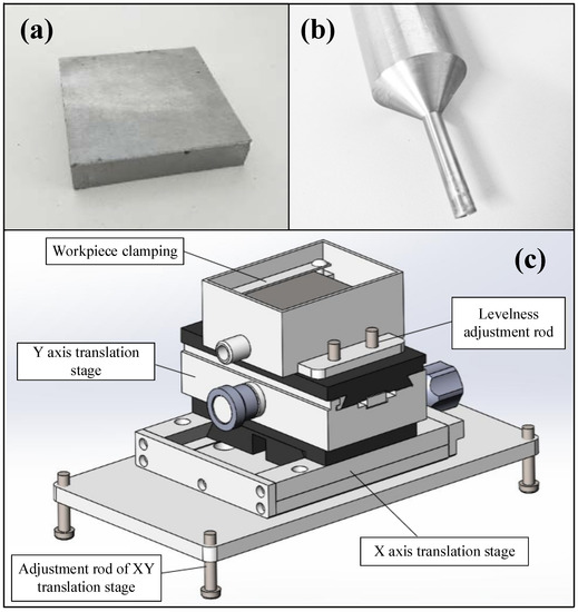 The main components of the electrochemical machining fixture were fixture of the tool electrode and the fixture used to installation workpiece. The relative position of the cathode and anode, the distribution of the electric field and the flow of the electrolyte were determined by the operating method of fixture. The fixture used for the installation piece is shown in Figure 2c. In order to ensure the levelness of the workpiece’s surface and the verticality between the tool electrode and workpiece after the installation, a four-point level adjustment method was adopted to adjust the level of the top surface of the platform. The height of each position on the upper surface of the workpiece was kept the same when the workpiece was moved by the translation stage in the XY direction, so as to ensure the relative position between tool cathode and workpiece.