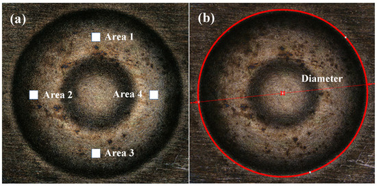 The surface roughness of the workpieces was measured by KEYENCE VK-X 3D laser scanning microscope (produced by Keyence, Japan) according to ISO standards. Four uniformly distributed areas of 1 mm2 in groove were selected. Four points with different position were selected in each area, as shown in Figure 3a. After eliminating the excessive machining error, the average value of measurements was calculated and was treated as the surface roughness of this machining. The accuracy of cylindrical was measured with the shape measuring tool, the profilometer, and the mean of three times measurement of the excircle was calculated, as shown in Figure 3b.