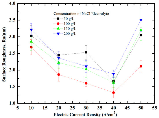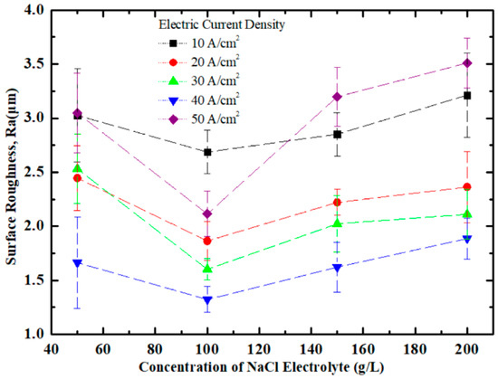 The mean value of the surface roughness of a workpiece at different concentrations of NaCl electrolyte under each current density was obtained, as shown in Figure 4. It was found that the workpiece surface roughness at the same current density decreased first, and then increased. The surface roughness after machining was generally batter than before except at a high electrolyte concentration and a high current density and the workpiece has the minimum surface roughness at electrolyte concentration of 100 g/L.
