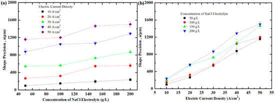 The shape precision at different current densities in the NaCl electrolyte was shown in Figure 8b. It can be found that the shape precision increased with the increase in current density. The reason is that after increasing the current density, the electric field strength of the machining gap increased and the influence of the surrounding electric field increased inevitably. So, the processing area expanded gradually and the shape precision became poor. Comparing the morphology of samples in Figure 7a–e, it can be seen that the diameter of the excircle increased gradually with increasing current density and the inner circle was gradually corroded off and could not be figured out.