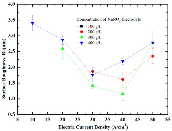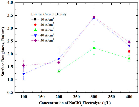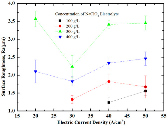 The surface roughness of a workpiece at different current densities is shown in Figure 11. It can be found that the workpiece surface roughness at the same electrolyte concentration decreased first, and then increased. The surface roughness at a current density of 30 A/cm2 was generally lower than others and had better surface quality.