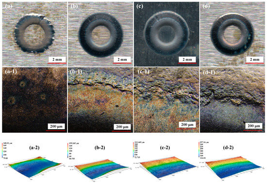 Surface morphology of workpiece at different concentration of NaClO3 electrolyte: (a) 30 A/cm2, 100 g/L; (b) 30 A/cm2, 200 g/L; (c) 30 A/cm2, 300 g/L; (d) 30 A/cm2, 400 g/L. Micromorphology of workpiece local surface: (a-1) 30 A/cm2, 100 g/L; (b-1) 30 A/cm2, 200 g/L; (c-1) 30 A/cm2, 300 g/L; (d-1) 30 A/cm2, 400 g/L. 3D profile of workpiece local surface: (a-2) 30 A/cm2, 100 g/L; (b-2) 30 A/cm2, 200 g/L; (c-2) 30 A/cm2, 300 g/L; (d-2) 30 A/cm2, 400 g/L.