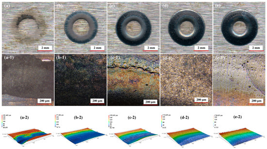 Surface morphology of workpiece at different current density in NaNO3 electrolyte: (a) 300 g/L, 10 A/cm2; (b) 300 g/L, 20 A/cm2; (c) 300 g/L, 30 A/cm2; (d) 300 g/L, 40 A/cm2; (e) 300 g/L, 50 A/cm2. Micromorphology of workpiece local surface: (a-1) 300 g/L, 10 A/cm2; (b-1) 300 g/L, 20 A/cm2; (c-1) 300 g/L, 30 A/cm2; (d-1) 300 g/L, 40 A/cm2; (e-1) 300 g/L, 50 A/cm2. 3D profile of workpiece local surface: (a-2) 300 g/L, 10 A/cm2; (b-2) 300 g/L, 20 A/cm2; (c-2) 300 g/L, 30 A/cm2; (d-2) 300 g/L, 40 A/cm2; (e-2) 300 g/L, 50 A/cm2.