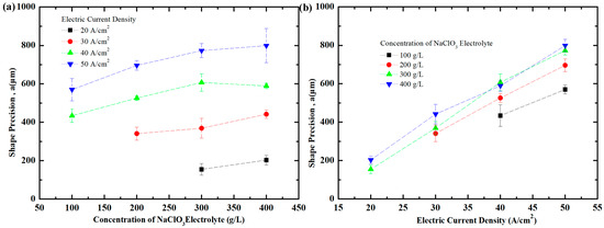 (a) Shape precision at different concentration of NaClO3 electrolyte; (b) Shape precision at different current density under NaClO3 electrolyte.