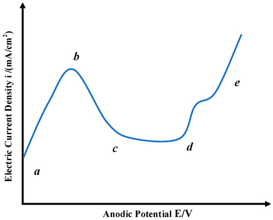 Figure 14 shows the polarization curve of NaClO3 [29]. The current density increased with the increasing of the electrode potential at a–b section. The passive film formed at point b and then current density decreased. The electrode was in a passivation state at c–d section. That is, the current density did not change with the increasing of the electrode potential. The electrode was in a transpassivation state at d–e section and the current density increased with the increasing of the electrode potential.