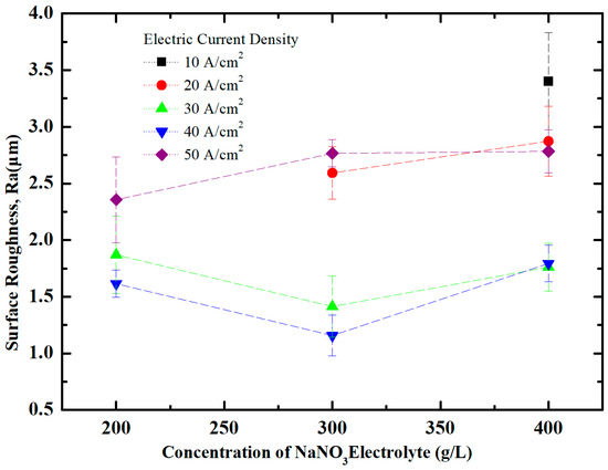 The surface roughness of the workpiece at different current densities is shown in Figure 6. It was found that the workpiece surface roughness at the same electrolyte concentration decreased first, and then increased. The surface roughness at a current density of 40 A/cm2 was generally lower than others.