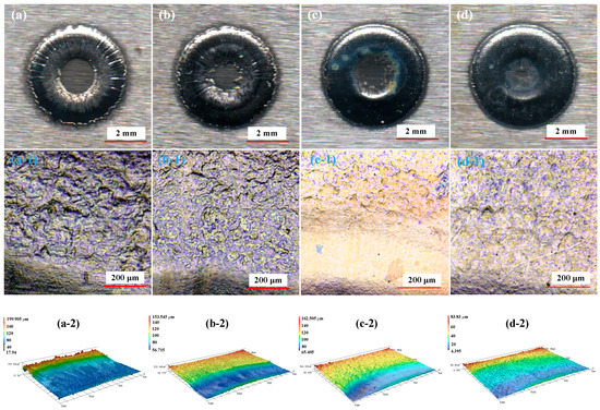 The surface morphology of workpieces at different current densities is shown in Figure 18. It can be seen that the electrochemical machining could not be performed at a low current density. The surface of the workpiece was sags and crests. The surface of the machining domain became smooth with increasing current density. The surface morphology is shown in Figure 18(a-1–d-1). It can be seen that the surface of the workpiece became smooth gradually and the surface quality became better. The best surface quality was obtained at a current density of 40 A/cm2.