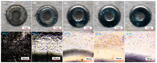 When the electrolyte concentration was 100 g/L, the surface morphology of the workpiece at different current densities is shown in Figure 7a–e. It can be found that the outlines of the inner and outer circle were clear and the workpieces after machining had a slight stray corrosion but the surface quality was fair. The stray corrosion became more severe and the outline of the inner circle became hardly distinguished with the increase in current density. The surface micromorphology in Figure 7(a-1–e-1) shows that the machining surface became fine. The machining workpiece could get the best surface quality at a current density of 40 A/cm2. Fine lines appeared on the workpiece surface at a current density of 50 A/cm2.