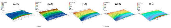 As shown in Figure 12(a-1–e-1), the surface of the machining domain was smooth under a current density of 30 A/cm2. While tiny projections or depressions appeared on the machining domain, which made the surface roughness increase and had a bad effect on the surface.