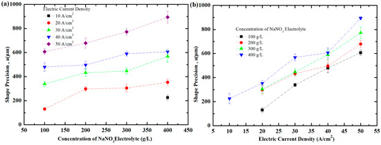 (a) Shape precision at different concentration in NaNO3 electrolyte; (b) Shape precision at different current density in NaNO3 electrolyte.