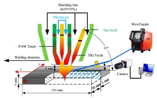 Given the continuous development of processing and manufacturing technologies, traditional arc welding techniques such as plasma arc welding (PAW) [] and tungsten inert gas (TIG) [,] welding process, have been improved to meet the requirements of enterprises for high-quality and low-consumption welding technology []. Based on the situation above, the hybrid welding methods with multiple heat sources are proposed. In recent years, hybrid welding methods have also been successfully applied in shipbuilding and spacecraft. Certain hybrid welding processes, including plasma–gas metal arc welding [,,], plasma–TIG [,], laser–GMAW [], laser–TIG [] and TIG–MIG [], have been successfully used in the manufacturing industry. In comparison with ordinary single-arc welding, hybrid welding technology can significantly improve welding efficiency and joint quality because it is simultaneously provided with multiple heat sources that complement one another [].
