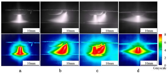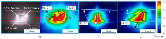 A notable characteristic of the plasma-TIG welding method is the physical coupling effect between the two arcs, which results in penetration increased and welding spatter reduced effectively compared with traditional GMAW (gas metal arc welding) hybrid welding technology. The detailed images of the plasma, TIG, and coupled arcs were acquired as shown in Figure 2. Furthermore, pseudo-color processing is implemented for converting the acquired Gray-scale images to pseudo-color images using Xiris WeldStudioTM® software (2.0.3, Xiris Automation, Burlington, ON, Canada), which will assists in analyzing the detailed information of arc profile. The base plate is made of red copper with forced recirculation cooling water and the welding experiment was carried out under the following conditions: a plasma welding current of 60 A while TIG current of 100 A, nozzle height of 5 mm and plasma gas flow of 15 L/min.