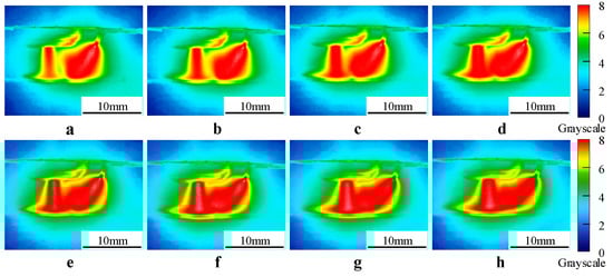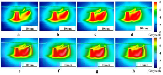 Acquired images of coupled arc profile with different TIG welding current: (a) 30 A; (b) 40 A; (c) 50 A; (d) 60 A; (e) 70 A; (f) 80 A; (g) 90 A; (h) 100 A.