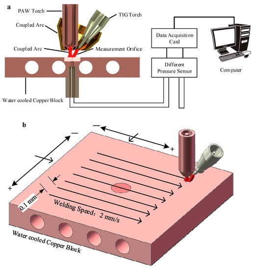 The arc pressure distribution on the workpiece allows the characterization of the coupled arc force on the molten pool surface and identification of arc physical properties, especially its effect on the penetration [,]. A differential pressure sensor (DPS: HSTL-FY01, Beijing, China) was utilized to detect the arc pressure on the surface of base metal as shown in Figure 7a. A measuring bore hole with a diameter of 0.8 mm is installed in the center of the plate, which was fixed on another water-cooled copperplate with a geometry size of 200 × 400 × 3 mm3 []. The real-time data acquisition of the sensor can be realized by the data acquisition card (YAV-USB2AD, Wuhan Yawei Electronic Technolgy CO., Ltd., Wuhan, China) using the technology of Labview®(National Instruments, Austin, TX, USA). The system is adjusted and calibrated through the software. To ensure accuracy of the results, the measurement point spacing is 0.1 mm and the torch moves at a constant velocity of 2 mm/s. The details of the measurement system are shown in Figure 7.