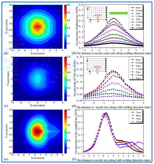 Stagnation pressure distribution of welding arc with the different method. (a) Top view of two-dimensional distribution of the plasma arc. (b) The plasma arc pressure along with welding direction with different distance to measurement orifice axis. (c) Top view of two-dimensional distribution of the TIG arc. (d) The TIG arc pressure along with welding direction with different distance to measurement orifice axis. (e) Top view of two-dimensional distribution of the coupled arc. (f) The coupled arc pressure along with welding direction with different electrode spacing.