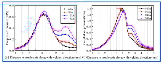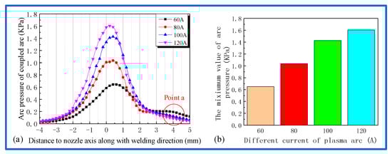 Group #1 is the single-factor experiment to examine the effects of plasma current on the coupled arc pressure distribution. The plasma arc as an important part of the coupled arc [], the variation in the current value has a significant influence on plasma flow force and mainly determines the maximum arc pressure of the coupled arc. The histogram of the coupled arc pressure is acquired by means of extracting the maximum value of distributed line type, as shown in Figure 9b. As can be seen from part a and b of Figure 9, the maximum arc pressure increases gradually with the rise in plasma current and reaches 1600 Pa as plasma current is 120 A. In addition, according to the changes of arc pressure curves at point a, it can be illustrated that the TIG arc pressure peak is overlapped with that of plasma gradually with increase of plasma current, that is due to increase in Lorentz force during the process. This result suggest that the coupling effect is strengthened between the two arcs with the increase of plasma current.