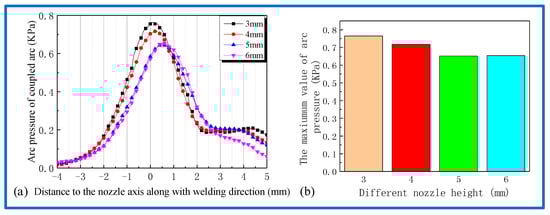 Coupled arc pressure with different nozzle height. (a) Coupled arc pressure along with welding direction. (b) Max value of coupled arc pressure.