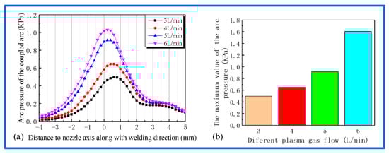 Coupled arc pressure with different plasma gas flow. (a) coupled arc pressure along with welding direction. (b) Max value of coupled arc pressure.