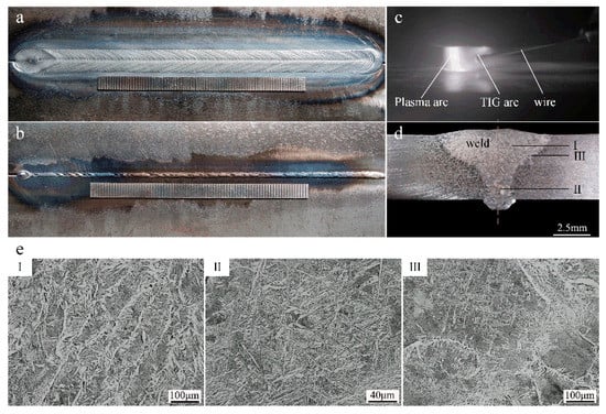 Appearance and microstructure of the weld. (a) The surface of the weld. (b) The back of the weld. (c) The coupled arc welding process with filler wire. (d) The cross-section of the weld. (e) The microstructure of the cross section.