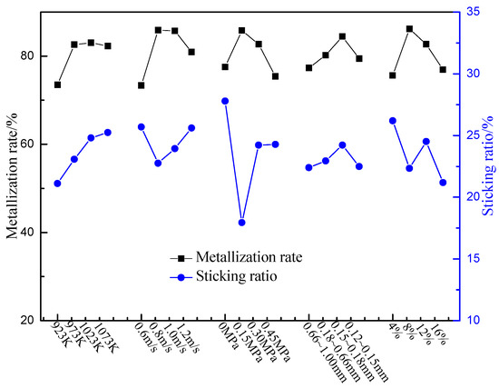 Fluidized reduction aims to achieve a high metallization rate without sticking. Therefore, a high metallization rate and a low sticking ratio were chosen as the optimal scheme. The metallization rate and sticking ratio of each experiment were measured, and results are shown in Table 5.