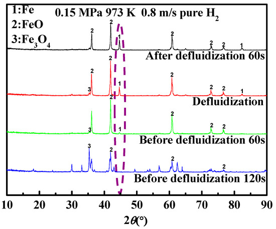 Under the conditions of pressure of 0.15 MPa, temperature of 973 K, reduction gas of pure H2, and linear velocity of 0.8 m/s, the law of the phase evolution of particles before and after sticking was studied, and results are shown in Figure 4.