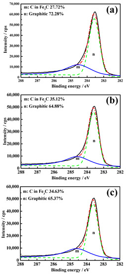 The different valence states of deposited carbon were determined with the help of XPS by studying the C1s core-level energy spectrum. Thus, the occurrence state of deposited carbon was obtained. Each XPS spectrum was used to produce a peak division fitting graph by using of XPS PEAK 4.1 and the Gaussian–Lorentzion method. The XPS spectra of C1 present a double peak structure, which shows that the deposited carbon possesses two occurrence states: carbon from Fe3C with a binding energy of 283.7 eV, and the free carbon with a binding energy of 284.6 eV [25,26]. Carbon from Fe3C and free carbon exist in the particles after the reduction of iron ore with the addition of deposited carbon from energetic waste plastics.