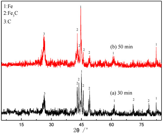 The XRD diagram of post-reduction fine iron ore: (a) 30 min; (b) 50 min.