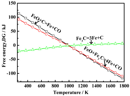 The thermodynamics analysis of the above-mentioned reactions was performed using Factsage thermodynamics software (7.2, ThermFact LTD, Mont-Royal, QC, Canada), and the Gibbs free energy change is shown in Figure 7. With the temperature in the range of 958–973 K, the reaction rate of H2 is better than that of CO [29,30] and the reaction free energy of (15) is lower than that of (13) and (14). Therefore, the latter reaction proceeds easier than the two previous reactions at this temperature. Moreover, the reaction free energy of (15) increases the rate of metallization and the content of graphite. This condition is also the reason for the slight increase in the graphite content and the slight decrease in the carbon content of Fe3C, which can be seen by comparing the reduction for 30 and 50 min in Figure 5.