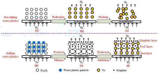 In order to improve environmental protection and production efficiency, the current study added energetic waste plastics into the iron ore powder [16] according to a certain size and ratio, resulting in the changing direction of the optimal operating parameters in a self-designed, hot visual, pressurized, fluidized bed experimental device. On this basis, economic, convenient, and effective operating parameters were determined. This research focuses on the mechanism of inhibiting sticking of iron ore powder particles by coated waste plastics, and it elucidates the mechanism of inhibiting sticking loss by carbon precipitation from pressure-coated waste plastics. Accordingly, data storage and the theoretical basis for the industrialization of direct reduction in fluidization are provided.