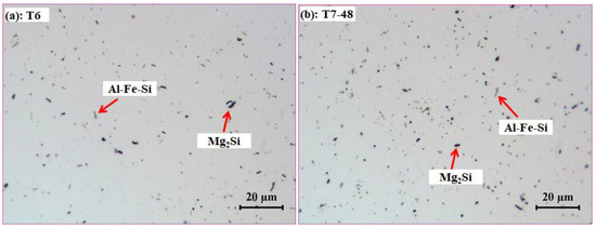 Figure 2 shows the typical optical micrographs of the investigated 6061 alloy under T6 and T7-48 conditions. Generally, two types of particles can be found in all four aging conditions: the gray Al-Fe-Si intermetallics and the black undissolved Mg2Si particles, both of which are fine due to the extrusion process [18]. No obvious change can be observed in the size and the volume fraction of the two intermetallic particles, as aging at 200 °C could not cause any remarkable changes in these intermetallic particles [19].