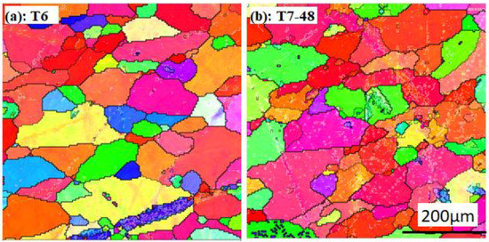 To reveal the grain size and structure, electron back-scattered diffraction (EBSD) mapping was performed for all four aged samples. The EBSD results show that the extruded materials were all fully recrystallized with equiaxed grains, and no difference could be found under the four aging conditions. As an example, the EBSD mapping images of T6 and T7-48 are shown in Figure 3. It can be observed that the equiaxed grains are all over the sample section in both aging conditions, with a similar grain size in the range of 60–100 μm.
