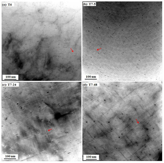 Typical tensile properties of the investigated 6061 alloy obtained under various aging conditions are listed in Table 2. As seen from Table 2, both the yield strength (YS) and ultimate tensile strengths (UTS) decreased, whereas the elongation increased, with increasing aging time. Only small changes in the strength were observed between the T6 and T7-5 conditions, and between the T7-24 and T7-48 conditions. However, a large difference in strength occurred between these two groups. For instance, YS only decreased by 11 MPa between T6 (286 MPa) and T7-5 (275 MPa), but YS dropped by 67 MPa from T7-5 (275 MPa) to T7-24 (208 MPa). The evolution of the mechanical properties was highly related to the precipitates under various aging conditions. As shown in Figure 4, the size of precipitates increased and the number density of precipitates decreased with aging time, leading to decreasing strength according to the Orowan strengthening mechanism [22]. Corresponding to the strength change, it can be observed that the precipitate sizes were similar between T6 and T7-5 (in the range of 60–90 nm), and between T7-24 and T7-48 (in the range of 200–220 nm). However, the morphology and type of the precipitates in these two groups changed significantly, whereby β″-Mg2Si precipitates of fine size were dominant in T6 and T7-5, while β′-Mg2Si precipitates of coarse size were prevalent in T7-24 and T7-48, which explains the sharp drop in strength from T6 to T7-24 and T7-48.