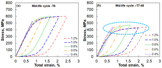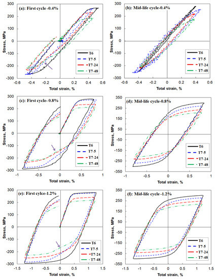 However, despite the similarity, there were differences under various aging conditions. Firstly, the shape of loops with longer aging time at T7 became inflected, especially at higher strain amplitudes. As indicated by the arrows in Figure 5a,c,e, the loops were noticeably flattened after T7-48, which was also reported in the work of Hidayetoglu et al. [8]. The inflection was only present during the first few cycles, and disappeared gradually as cycling proceeded. As shown in Figure 5b,d,f, no obvious inflection could be observed during the mid-life cycle. The inflection for the first few cycles with longer aging time can be attributed to the different precipitates formed during the aging treatment [8]. For the T6 and T7-5 conditions, as shown in Figure 4, the precipitates could be sheared [17] during the “to-and-fro” motion of dislocations during LCF, leading to the “normal” hysteresis loop without inflection. Nevertheless, the precipitates were non-shearable under the T7-24 and T7-48 conditions. These non-shearable precipitates pinned the movement of dislocations by forming a dislocation loop, resulting in a population of mobile dislocations around each precipitate when the forward stress was first applied. These dislocation loops can provide a limited amount of strain in the reverse direction at relatively low stress. Only when they are exhausted will the reverse stress increase to a value approaching that of the forward stress in order to continue reverse straining, thereby causing the inflection in the first few cycles. With increasing cycles, the contribution of dislocation loops diminishes, and then, the inflection disappears [8].