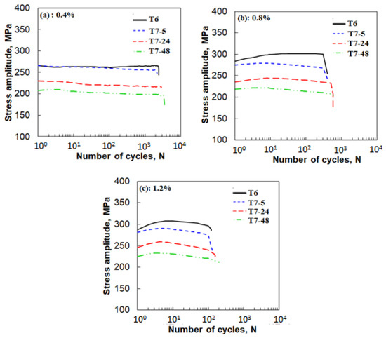 It was observed from Figure 7 that the stress amplitude augmented, whereas the fatigue life decreased with increasing strain amplitude. It can be found that the stress amplitudes of T6 and T7-5 were always higher than those of T7-24 and T7-48 at all strain amplitudes tested. In addition, a similar cyclic response was observed for all aging conditions, although it was different at applied strain amplitudes. At the low strain amplitude of 0.4% (Figure 7a), cyclic stabilization occurred under all aging conditions. At the middle strain amplitude of 0.8% (Figure 7b), initial hardening can be observed during the first few cycles (~10), followed by stabilization from T6 to T7-48. When the higher strain amplitude was applied (1.2% in Figure 7c), hardening appeared during the first few cycles, followed by softening until failure for all aging conditions. Because the hardening only happened during the first few cycles, the cyclic response for all aging conditions can be described as stabilization at lower stain amplitudes, and softening at higher strain amplitudes. However, minor differences can be found in the hardening or softening rates under various aging conditions. As shown in Figure 7c, the hardening rates in the first few cycles were higher, with lower softening rates in the following cycles under the T6/T7-5 conditions than under the T7-24/T7-48 conditions, which explains the increasing difference in stress and the decreasing difference in plastic strain between the first and mid-life cycles, as shown in Table 3.