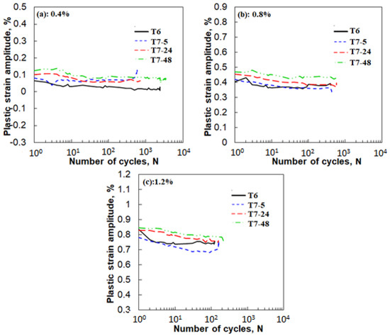 In the LCF tests, the plastic strain amplitude was considered as a physical quantity that resulted in several damaging processes, and it influenced the internal microstructure, which was closely related to the strain resistance, and eventually, the fatigue life [28]. The variation in plastic strain amplitude (Δεp/2) during cyclic deformation at various strain amplitudes (0.4%, 0.8%, and 1.2%) under various aging conditions is shown in Figure 8, which corresponded well with the change in stress amplitude during cyclic deformation, as shown in Figure 7. As shown in Figure 8, the plastic strain amplitude also increased with total strain amplitude. When the total strain amplitude was low (~0.4% in Figure 8a), cyclic stabilization was observed. With increasing total strain amplitude (0.8% in Figure 8b, and 1.2% in Figure 8c), plastic strain decreased with cycles.