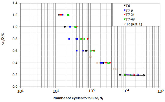 Figure 9 displays the total strain amplitude (Δεt/2) as a function of the number of cycles to failure (Nf, i.e., the fatigue life) for the investigated 6061 alloy under various aging conditions, in comparison with the data reported in the literature [1]. The run-out data points are marked by arrows pointing horizontally at or over 104 cycles. Overall, the investigated 6061 alloy showed a trend of increasing fatigue life with decreasing strain amplitude, and it also showed an improved fatigue life compared to the data reported in the literature [1]. In general, the fatigue life increased with increasing T7 aging time. It is apparent that the fatigue life under the T7-24/T7-48 conditions was longer than that for T6/T7-5.