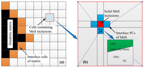 where HMn and HS are the relative atomic mass of Mn and S, HMnS is the relative molecular mass of MnS, Δx is the reaction amount of Mn (wt. %), ΔfS,MnS is the increment of solid fraction of MnS, ρFe and ρMnS are the densities of Fe and MnS (kg·m−3). Temperature, [Mn] and [S] of PCs can be computed via linear interpolation using corresponding values of neighbor matrix grids in the liquid phase, as shown in Figure 2a,b. The solid fractions of PCs increased gradually to 1, making them a complete solid cell, and then their surrounding PCs were renewed as interface cells of MnS to repeat MnS evolution, accompanied by matrix growth until thermodynamic equilibrium was restored.